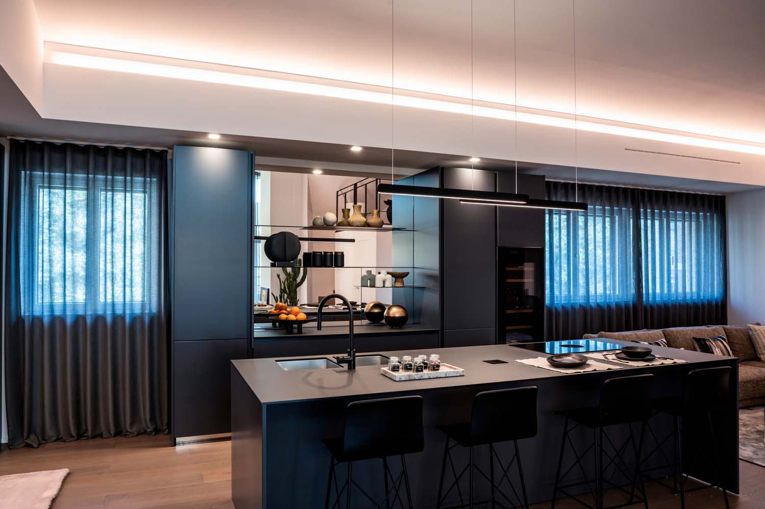 Inoltre, una cucina moderna con isola diventa subito protagonista dell’ambiente: linee pulite, materiali contemporanei e giochi di volumi contribuiscono a dare carattere all’intera zona giorno.