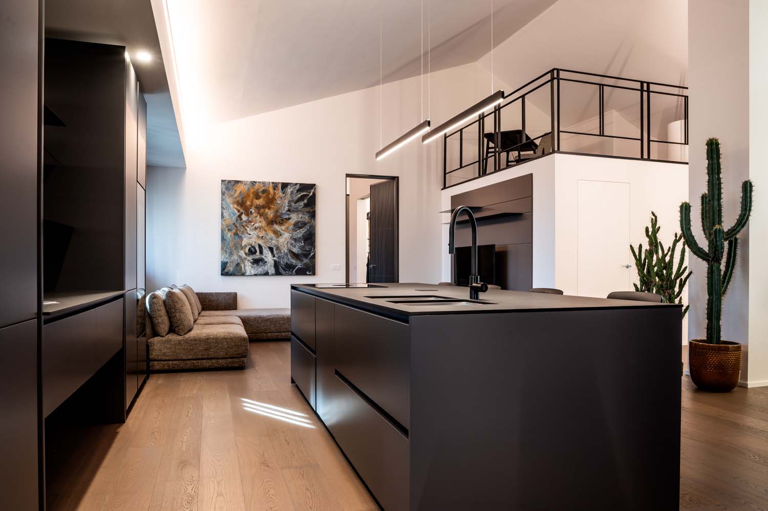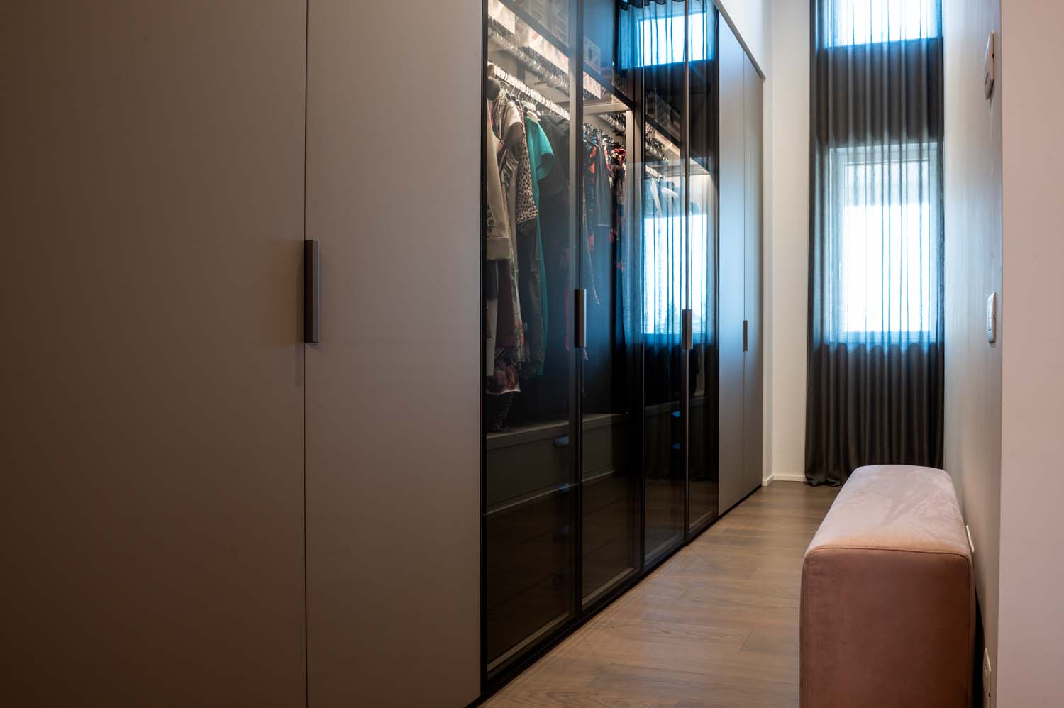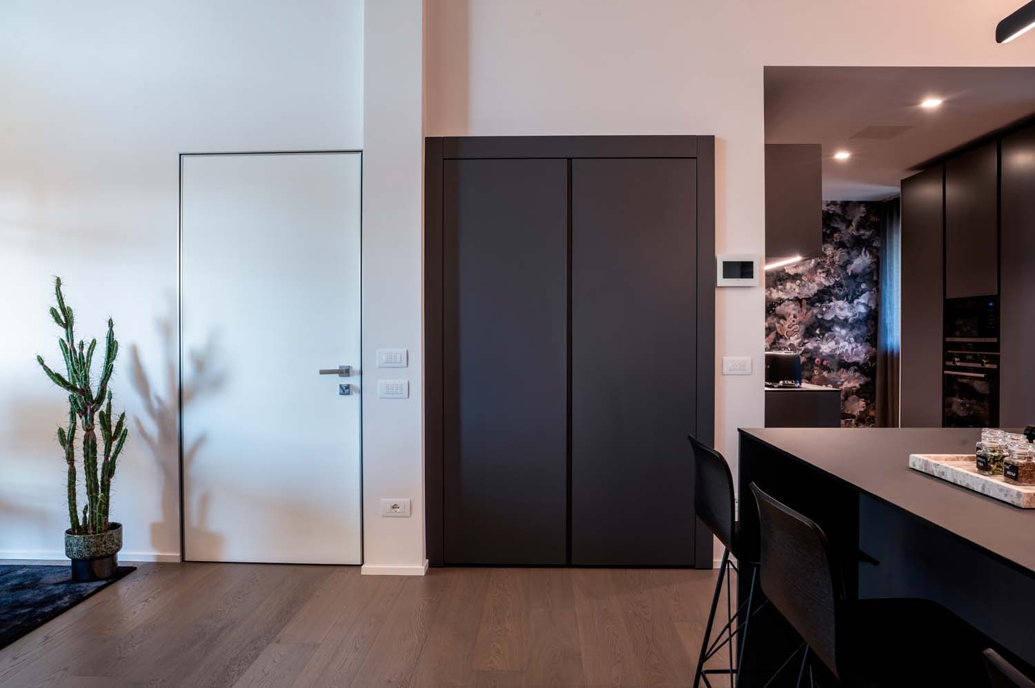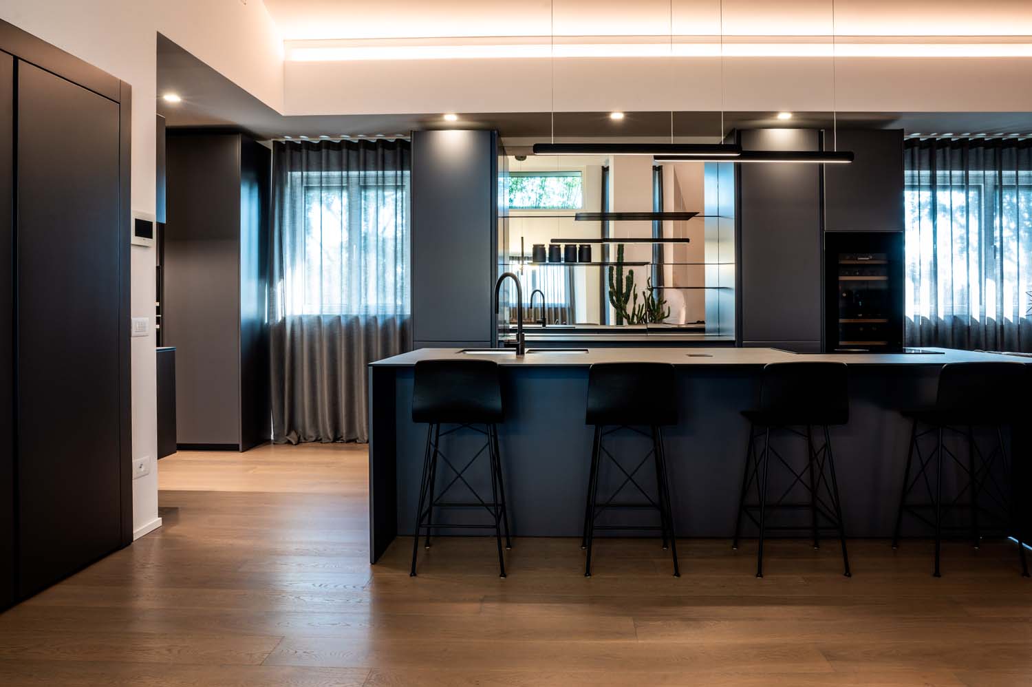 Il progetto ha interessato l’intera abitazione, comprendendo cucina, area TV, zona pranzo, area armadi e bagni, sviluppati come ambienti tra loro collegati. Ogni spazio è stato progettato con attenzione per garantire continuità stilistica e funzionale, contribuendo a creare una casa fluida, ben organizzata e coerente sotto ogni punto di vista.